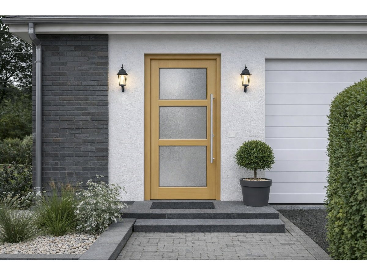 Das schmale Glaselement bringt Tageslicht in den Flur, ohne Privatsphäre zu verlieren, und verleiht der Tür eine elegante Wirkung. Die Haustür wird auf Maß gefertigt, ab 20 Arbeitstagen montagebereit geliefert und transportsicher an Ihre Wunschadresse versendet.